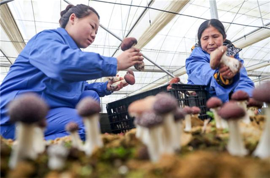 2月27日, 四川省廣安市岳池縣茍角鎮(zhèn)紅朝門村柏氏食用菌種植專業(yè)合作社的社員, 在采收特色精品大球蓋菇。