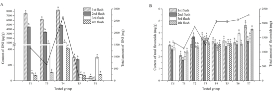 圖2 不同栽培配方獲得猴頭菇子實體中1-脫氧野尻霉素(DNJ,A)和黃酮(B)含量差異