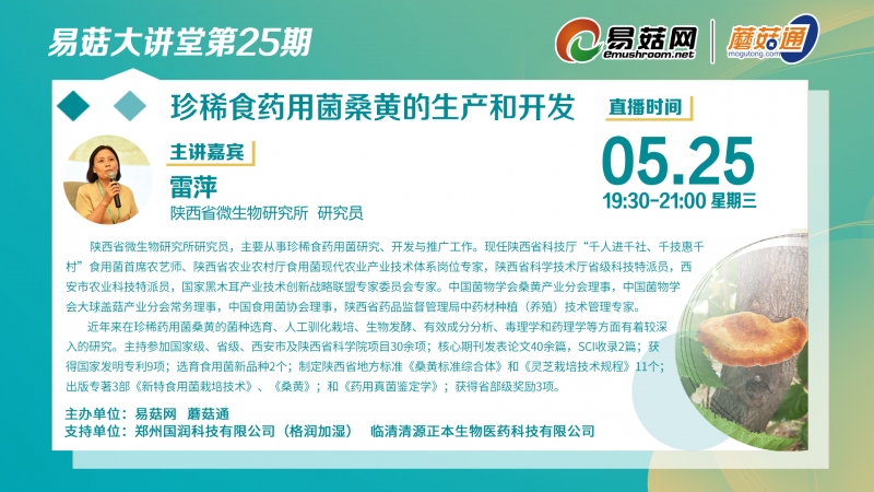 近年來,國內外菌物學工作者在桑黃類真菌的生物多樣性、系統發育、人工栽培技術、化學成分、藥理藥效、基因組等方面取得了大量新的研究成果,提升了桑黃的利用率,在藥用真菌研發領域中,桑黃逐漸成為一個新亮點。易菇網特邀請到陜西省微生物所研究員雷萍作客第25期易菇大講堂,擬于2022年5月25日晚通過網絡直播的方式,就“珍稀食藥用菌桑黃的生產和開發”為主題進行講座,并安排互動討論環節,歡迎想要學習了解桑黃有關知識食用菌產業同仁報名參加,有關活動安排如下: