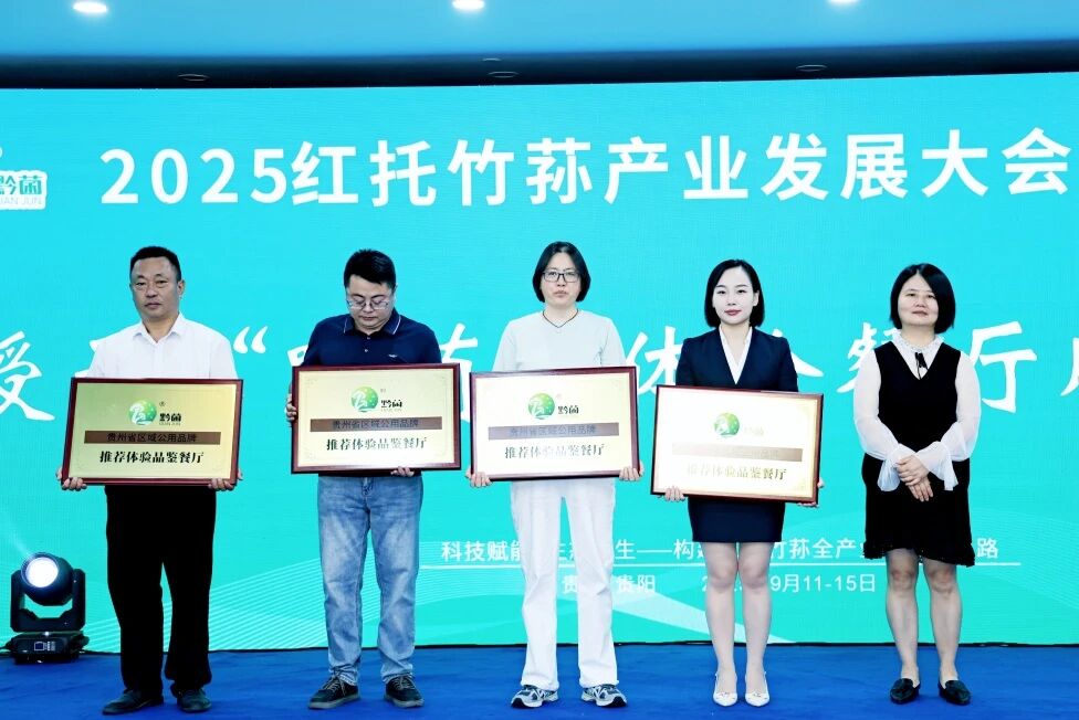 最后,進行 “黔菌”體驗餐廳授牌儀式,貴州泰韻餐飲服務有限公司、黔大叔臻品餐廳、格桑花開蔬食餐廳、貴陽觀山湖黔蘑菇四季餐廳成為首批授牌單位,為消費者提供了品嘗和了解紅托竹蓀及各類黔菌美食的平臺,對推廣黔菌文化、提升黔菌品牌知名度和美譽度具有重要意義。 “