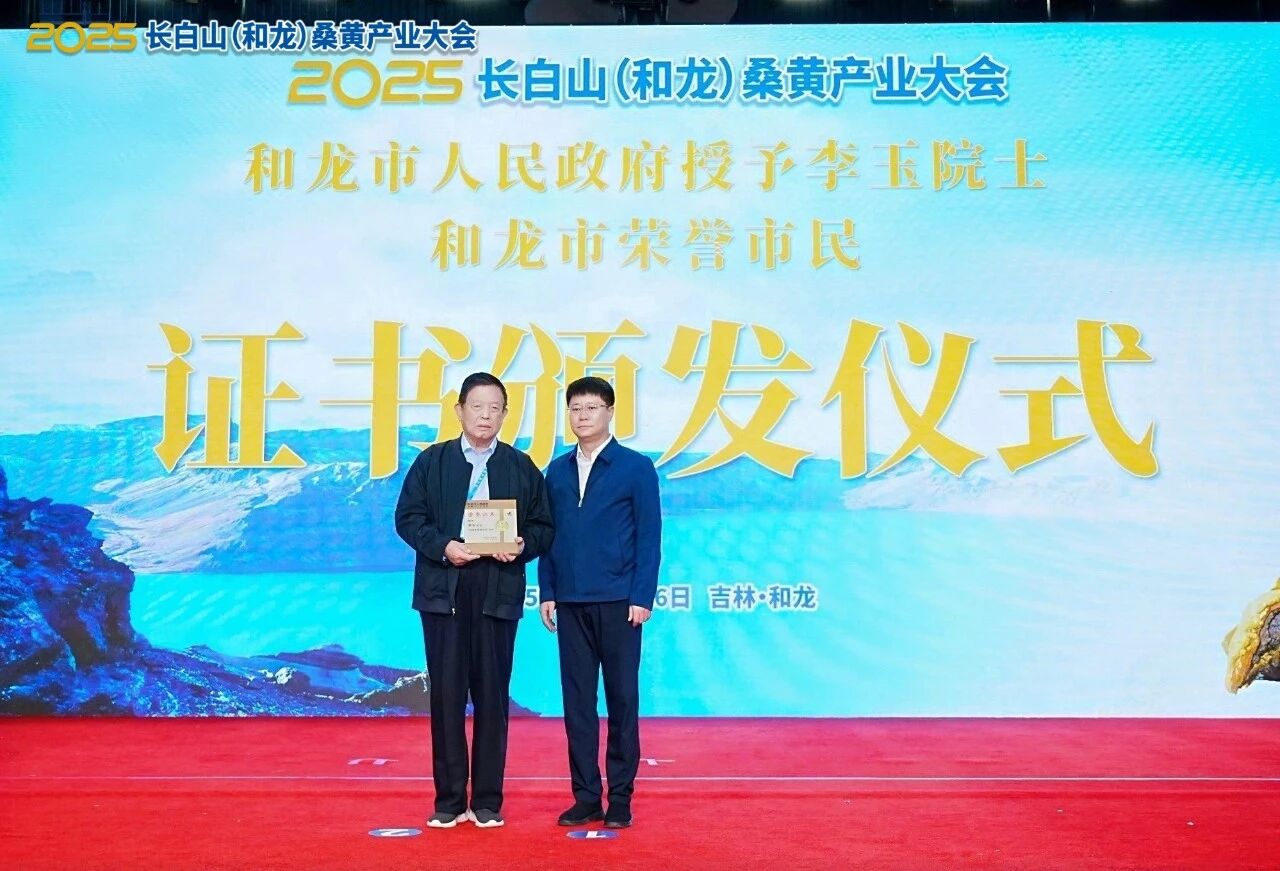 為感謝李玉院士對長白山桑黃產業乃至全國菌物事業發展所付出的深情厚誼與杰出貢獻,和龍市人民政府聘請李玉院士為“和龍市榮譽市民”。和龍市委副書記、和龍市人民政府市長樸哲萬同志上臺頒發證書。隨后,李玉院士向吉林桑黃生物科技集團有限公司桑黃研究院捐贈其團隊編著的食藥用菌專著。