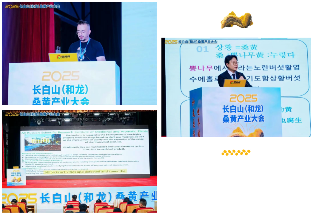 2025年9月24-26日,“2025長白山(和龍)桑黃產業大會”在和龍市金達萊國際論壇中心圓滿閉幕!會議吸引了超500余名桑黃研究的專家學者、產業界企業家、種植戶、從事生產和貿易流通的一線從業者,和媒體界的朋友們共聚和龍,共話桑黃產業新發展,助推“和龍桑黃”品牌走向全國、邁向世界。