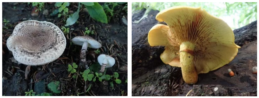 伴隨眾多食用菌,一些有毒蘑菇也悄悄鉆進(jìn)校園角落野蠻生長(zhǎng),如肉褐鱗環(huán)柄菇Lepiota brunneocarnea Rick、橘黃裸傘Gymnopilus junonius(Fr.)P.D.Orton等(見下圖,圖文順序一致),這是需要警惕和防范的。