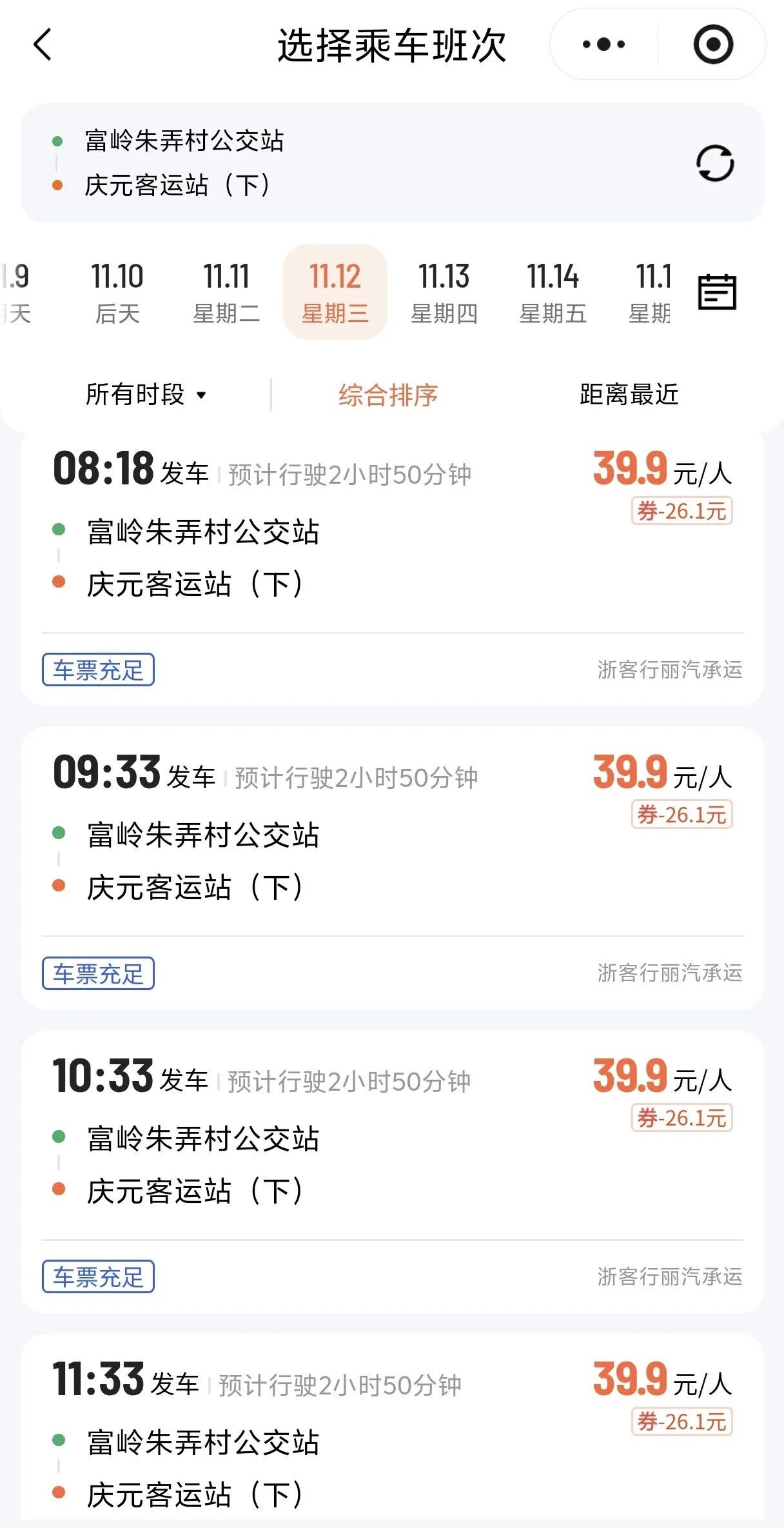 站點巴士乘坐指引:微信搜索滴滴出行小程序,打開點擊站點巴士,進入后出發點選擇麗水市富嶺朱弄村公交站,到達點選擇麗水市慶元客運站。站點巴士可提前購票。